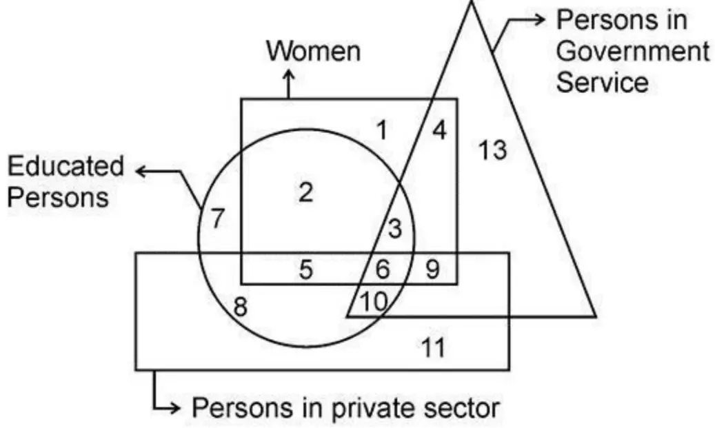JIPMATLogical Reasoning > Conceptual✅ Correct Option: 1Related questions:JIPMAT 2024Study the diagram given below and find the number which represents the uneducated women, who have a government job as well as a job in private sector? JIPMAT 2025Who among the following is neither a dancer nor a musician but is a businessman and not an Indian?JIPMAT 2021Which of the following figures correctly represent the relation between Tall men, Black haired people, Indians: